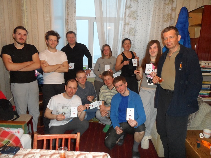 Посвящение мы не проводим, все живут отдельно, поэтому трудно всех собрать в одном месте. Но значки "Альпинист России" все обмыли в рюмке с водкой и запили горячим чаем с тортами.