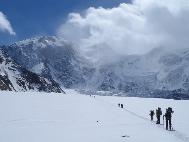 До Томских ночевок доходим неспеша и довольно быстро, ставим палатки и готовим ужин. К вечеру небо потемнело и пошел снег. Шел всю ночь и только к 10 утра начало проясняться и появилось солнце. Выпало полметра. Сегодня было решено сходить и пробить тропу под перевавл и провешать веревками подьем на перевал Делоне. На следующее утро, при хорошей погоде, мы благополучно поднялись на перевал и спустились на ледник Менсу. Снега много, но это кстати, все трещины под снегом, мы за три часа спускаемся на ледник под перевал Берельского.