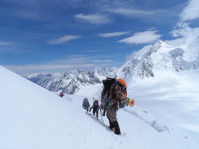 Наверх уходит отряд из 21 альпиниста - 2 инструктора и 19 участников. Горы в отличном состояние, крепкий наст и мало снега, опять солнечно и тепло. Пятый день хорошей погоды.