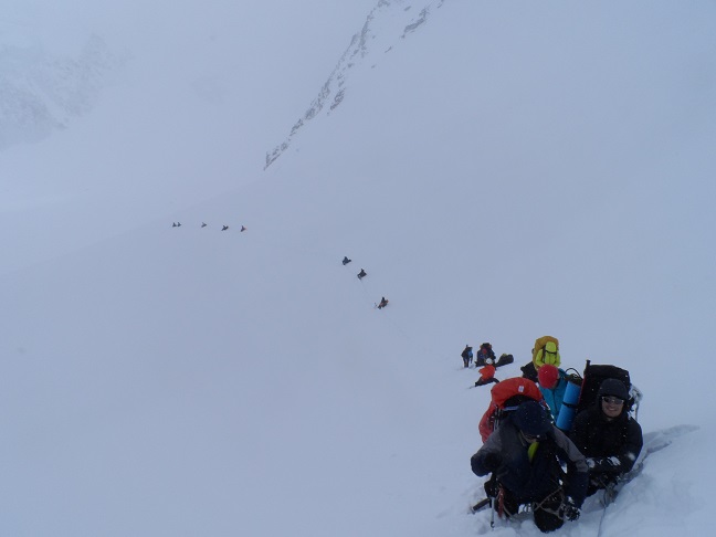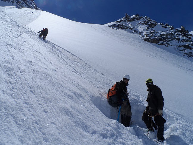Как только появилось небольшое окно, мы быстро собираем наш лагерь и уходим наверх, к перевалу Делоне. На пологом леднике снега выше колена, на крутом склоне пришлось топтать снега по грудь, рыть траншею. На перевале очень сильный ветер, но веревки у нас были оставлены, поэтому только спуститься по ним. Но и это заняло три часа. На приюте Томские ночевки поспокойней и теплей. Все наши молодые альпинисты забились в приют и не захотели спать в палатках. Ночевали по очереди, лишь бы не на улице. Вся одежда и спальники, после ночевок на Менсу были насквозь мокрыми. Многие готовы были спускаться и дальше, идти всю ночь к теплу. Но в горах надо думать не только о себе, но и о других. Не все способны совершать такие переходы, тем более ночью. Пришлось напомнить о дисциплине в группе. Многие приехали в горы в первый раз, для них это серьезное испытание.