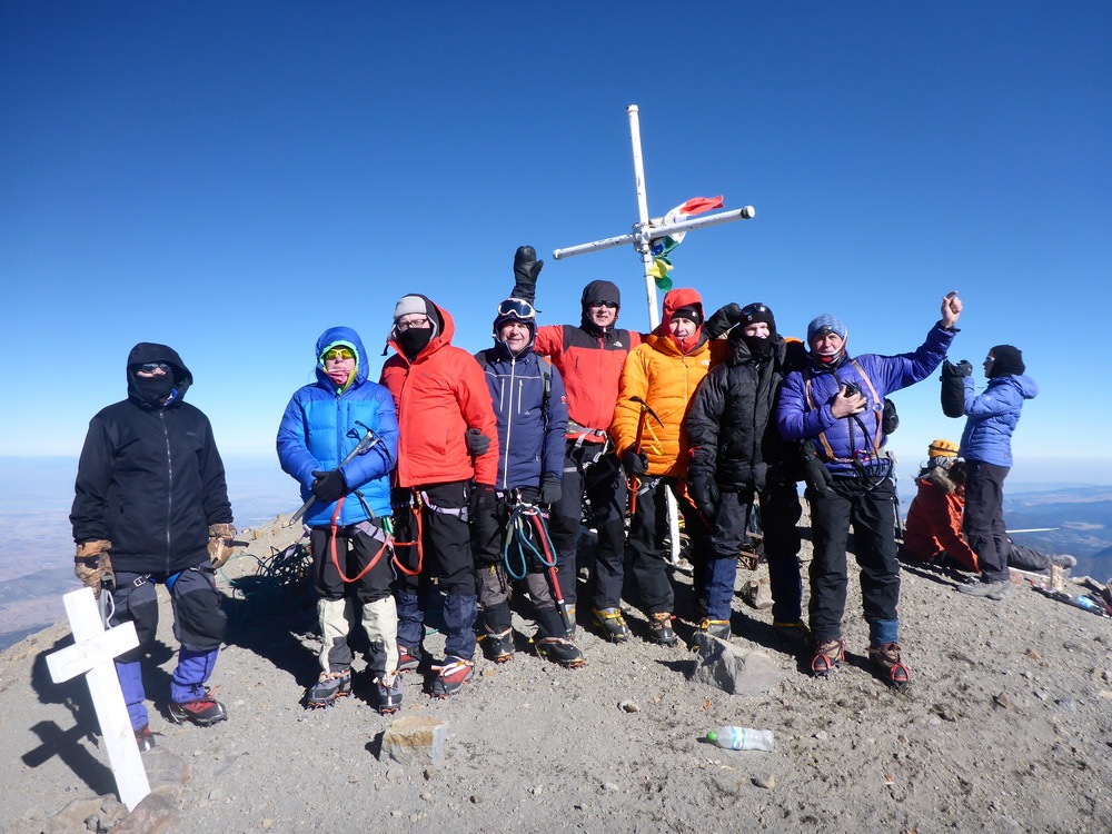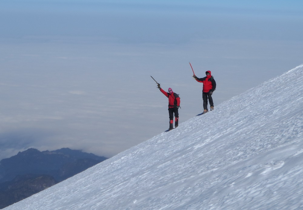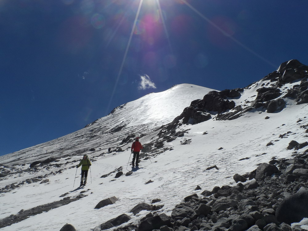 Решили днем прогуляться наверх. Каждый выбрал свой темп и высоту, на которую необходимо подняться. Я пошел первым. Через полтора часа за мной остались три участника. Тропа шла по снегу и круто забирала вверх. Я решил одеть кошки и прогуляться еще выше. У ребят кошки оказались с собой только у одного человека – Загидуллина Руслана из г. Кушва. В итоге мы остались вдвоем. Через полчаса тропа вышла на ледник, навстречу нам спускались альпинисты с вершины. Было тепло и тихо. Я решил подниматься наверх. Руслан, не отставая, следовал за мной. Склон становился круче и круче. Приходилось траверсировать его в сторону, поскольку лезть в лоб было тяжело. Альтиметр показывал высоту 5400м, когда мой напарник начал отставать. Я решил подождать его, фотографируя прекрасные виды. Когда Руслан поравнялся со мной, видно было, что ему тяжело, однако он шел вперед с явным желанием достичь вершины. Дальше шли медленно, но склон начал выполаживаться. Впереди на фоне неба показалась каменная гряда. Подойдя ближе, я увидел торчащий из камней крест. Это была вершина, а каменная гряда представляла собой кромку кратера.