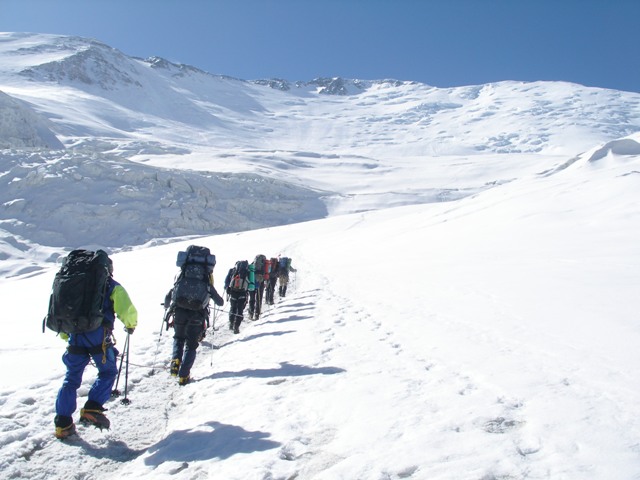 Пошел снег, поднялся ветер и была плохая видимость. Вся команда повернула вниз.