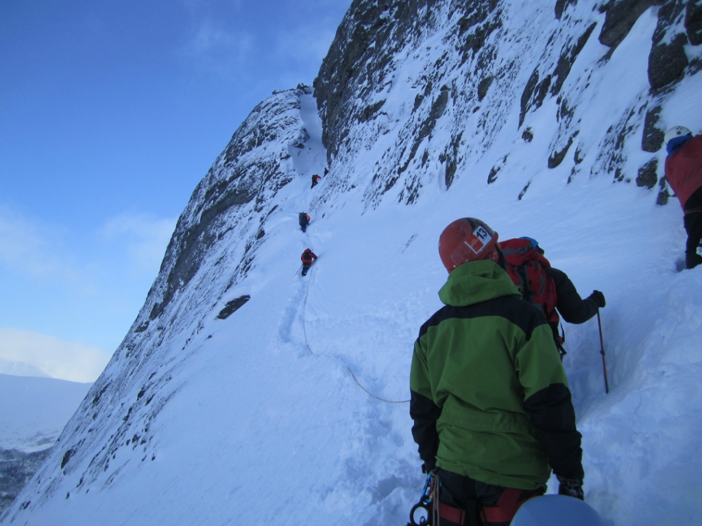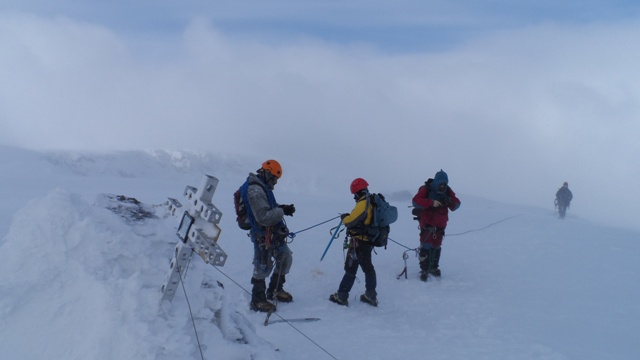 Из-за большого снега на скалах и непогоды, маршруты 3А пришлось проходить 2 дня, за день не успевали! Вертикальные снега, бараньи лбы покрыты настом!