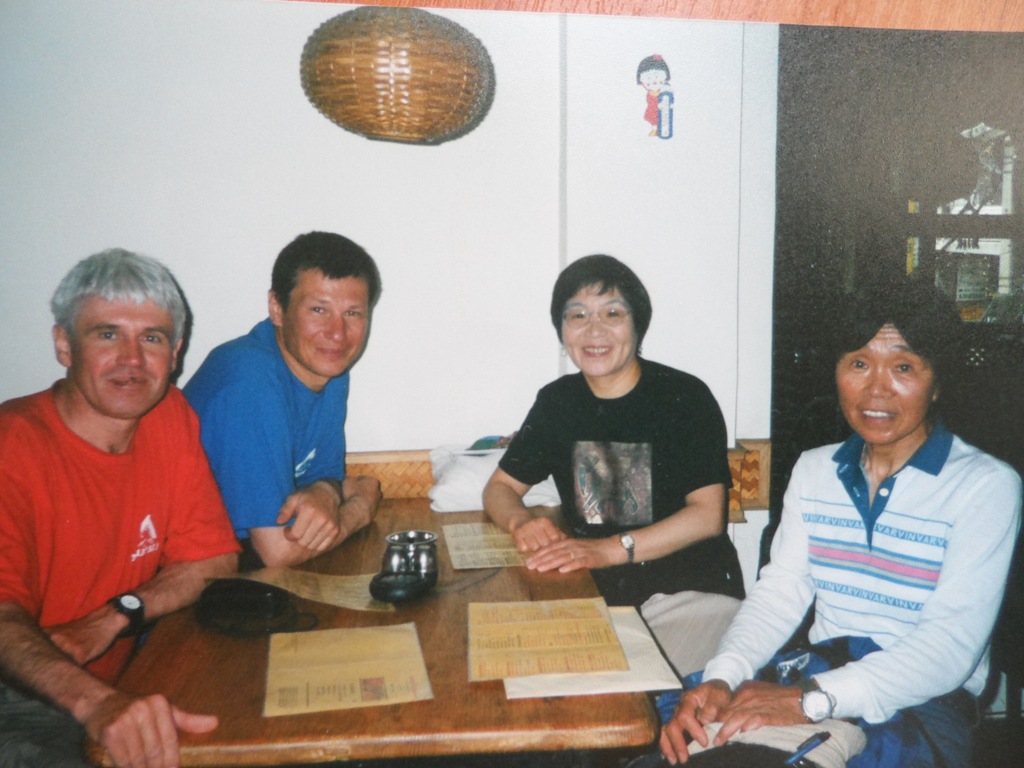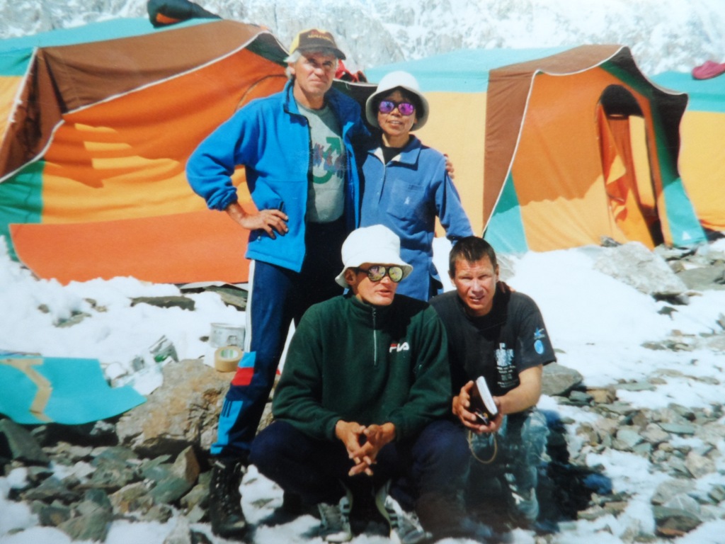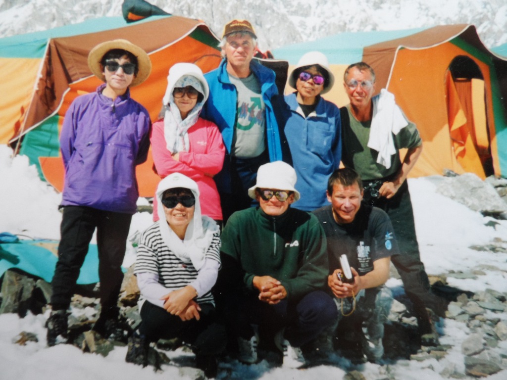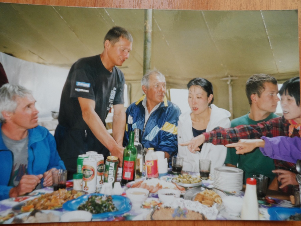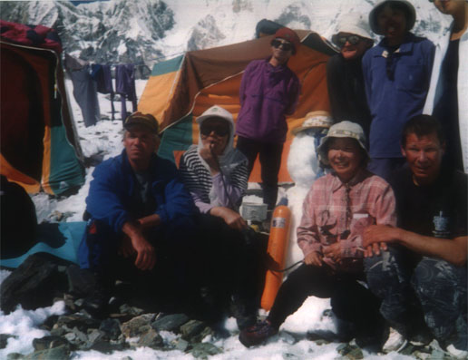 Нас размещают в удобных 2-х местных кемпингах. Разложив спальные мешки и разбросав по углам тёплые вещи и снаряжение, довольные, мы идём в столовую - большую брезентовую палатку, где уже собрались все, кто прилетел с нами. А это японская команда из восьми женщин, под руководством известной альпинистки, первой из женщин, покорившей Эверест госпожи Юнки Табэй, и мы, три русских гида - Ермачек Юрий, Болотов Алексей и Павленко Дмитрий. Всех нас объединяет одна цель и одно желание - взойти на вершину Победы. Что примечательно это то, что на Тянь-Шане объединились две стабильные команды альпинистов - японская и русская, участники которых из года в год одним и тем же составом выезжают в горы и участвуют в высотных восхождениях. Летом 1998 г. все женщины входили в состав японской экспедиции "Серебряная черепаха", состоящей из 20 человек, возраст которых колебался от 47 до 65 лет на вершину Гаршербрум II (8035 м), что в Пакистане. Тогда шесть альпинисток Японии покорили вершину. Нас троих объединяет совместное восхождение по Западной стене на вершину Макалу (8475 м) в 1997 г., отмеченное международным призом "Золотой ледоруб".