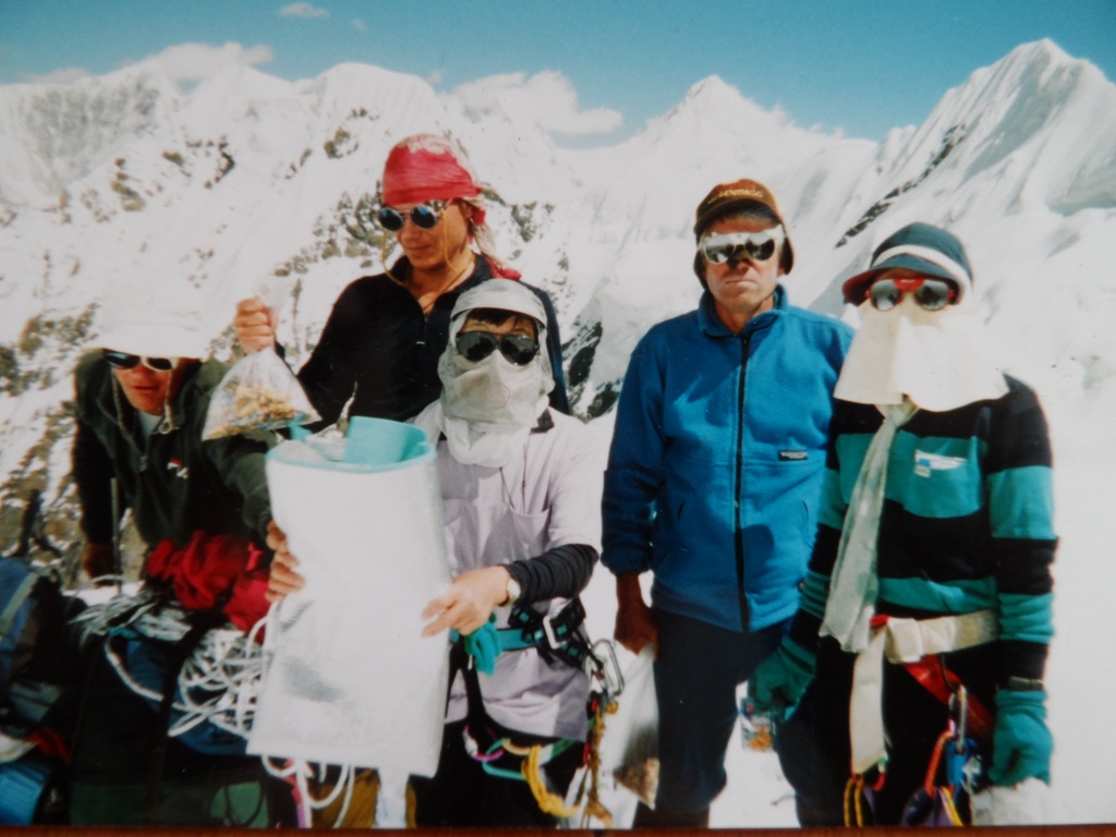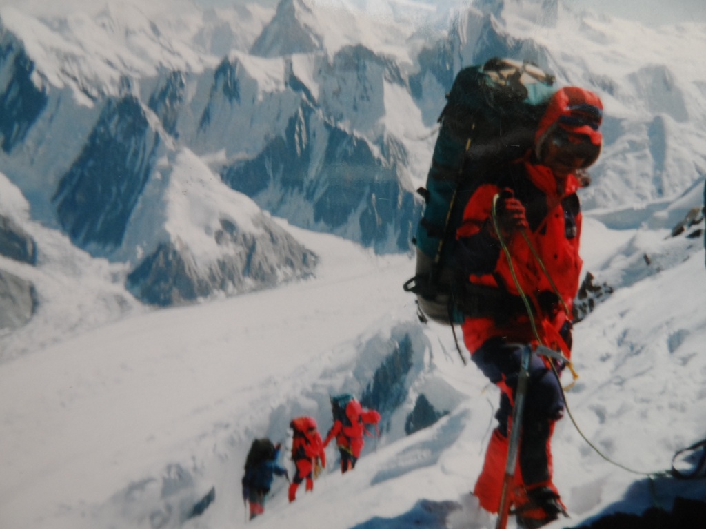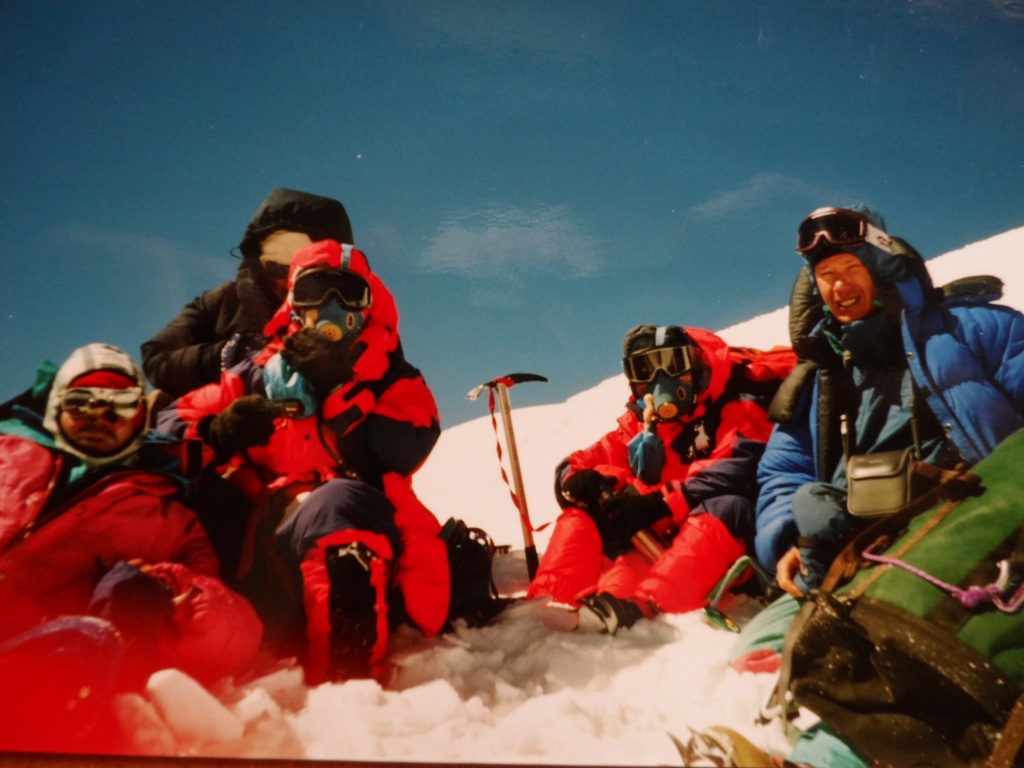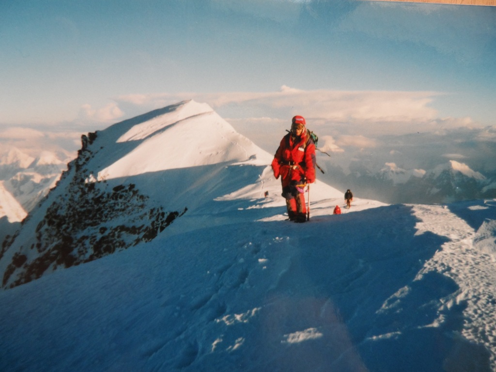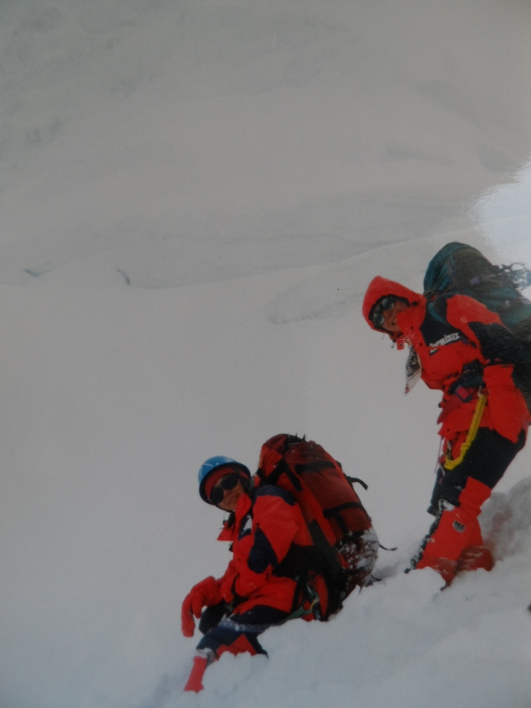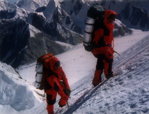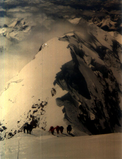 По ходу движения определился порядок следования альпинистов друг за другом. Впереди - Юрий Ермачек, за ним идёт, не отставая, госпожа Ватанабе Танае. Отстав на приличное расстояние, идёт вторая двойка: Дима Павленко и госпожа Мадзима Ханако. Замыкают группу Алексей Болотов и госпожа Юнка Тобэй. Чтобы догнать первую двойку и не снижать темпа движения Алексей с Димой надевают своим напарницам кислородные маски и подключают кислород. Это сразу даёт положительный эффект, и вскоре мы идём все вместе не отставая друг от друга. За три часа мы прошли 3-х километровый траверс и дошли до места на гребне, где начинается подъём на главную вершину. Это хороший результат и мы все рады этому. Немного отдышавшись, оставив рюкзак с палаткой и связавшись верёвкой, ровно в 10 утра мы начинаем подъём. Здесь мы подключаем третий кислородный баллон к маске госпожи Ватанабе Танае. Теперь все три японских альпинистки дышат кислородом. Преодолев 300 метров крутого снежного склона, выходим на крутые скалы. Приходится двигаться попеременно. Первый выходит на всю верёвку и закрепляет её, организуя перила, остальные идут одновременно по закреплённой верёвке.