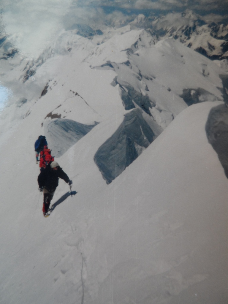 Сразу после скал - самый опасный участок - острый снежный гребень, который и влево и вправо обрывается крутыми снежными склонами вниз. В одиночку сорвавшись, здесь вряд ли можно задержать своё падение. Используя перильную верёвку и зарубаясь в снег ледорубом, медленно проходим этот участок. Дальше гребень хоть и крутой, но более широкий, поэтому идём одновременно. Выпавший за ночь снег ещё не успело сдуть ветром, и это облегчает нам путь. Успев размякнуть под лучами солнца, он хорошо образует ступеньки. Хочется идти быстрей, но высота затрудняет дыхание, всё чаще приходится отдыхать.