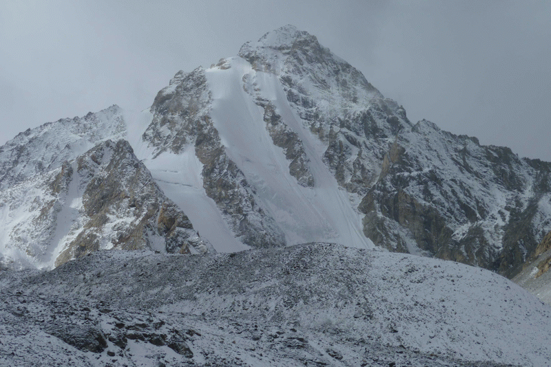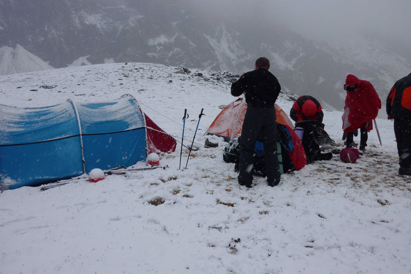 На седле перевала замыкающие были в 13-30, а через полчаса все уже спустились на плоский ледник. Пересекли его и поставили палатки в безопасном месте. Весь остаток дня, устроив уютное лежбище из карематов, спальников и тёплых курток, валялись в палатке и отдыхали. Туман, снегопад. Маршрут не видно, наша Гора изволит показать только подножье. Однако я разглядела, что сейчас снегу на склонах значительно больше, чем было три года назад.