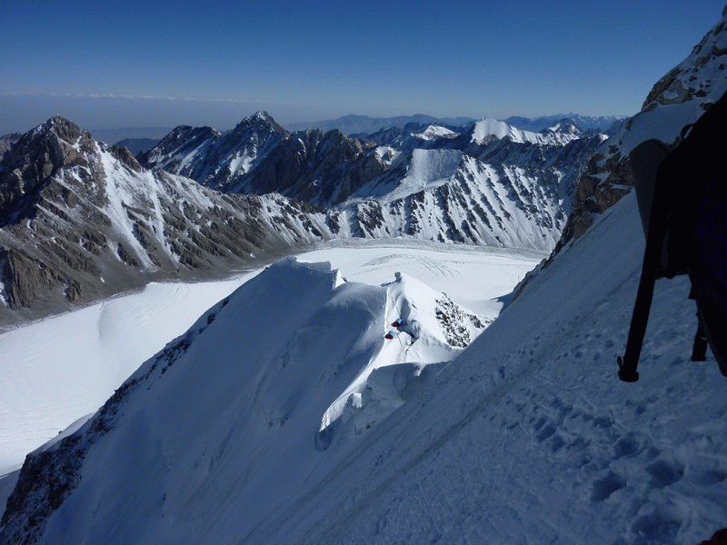 Напротив нас, в дальнем конце ущелья, возвышается покрытый снегом Акташ. Из-за него выглядывает ещё более далёкий и высокий пик Узбекистан. Картина на фоне чистого неба - не оторвать взгляд.