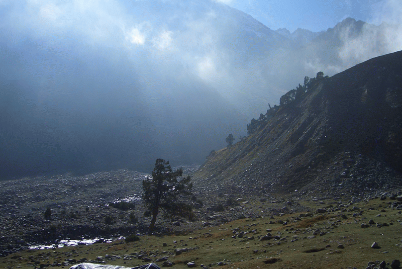 Около полудня мы сняли свою 'Канченджангу' и ушли. Специально остановилась, чтобы при ярком солнце разглядеть полосы тех самых двух снежников, которые чуть не заманили меня ночью. Вот это была бы ловушка!.. Ценный Урок, что НИКОГДА нельзя терять внимание и ходить 'на автомате'. При ЛЮБОМ физическом состоянии!!!