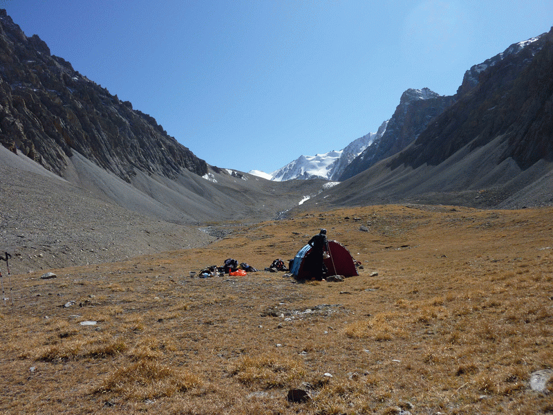 Обед, разговоры, очередная фаза ремонта. Вчера ночью Борису удалось кое-как заткнуть и придавить рюкзаком огромный разрыв на торцевой стенке палатки. Сегодня стараюсь зашить, но это уже очевидный финиш. Гнилая ткань расползается и восстановлению не подлежит. Кстати, палатка 'историческая', она тоже была на Узбекистане как минимум два раза. Причём в сентябре-2008 перед выходом мы её же и зашивали вдвоём с Ермачеком (я с уверенностью на 100% опознала по своему 'фирменному' стежку). Но сейчас всё, что могу сделать - это прикрепить свободно висящую стенку внутреннего слоя к днищу. Наружный слой пал в неравной борьбе со вчерашним ветром.
