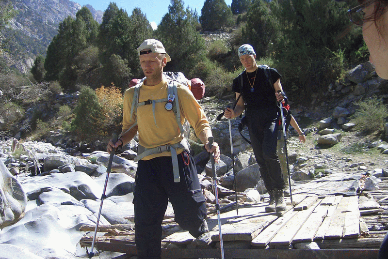 И еще тем, что узбекский солдат фотографировал каждого на примитивную цифровую 'мыльницу' (мы предлагали ради скорости сделать групповое фото, однако не прокатило). Юра Ермачек уже сказал было, что нас вот-вот нагонит вторая часть команды, едущая из Бишкека, но тут ожидание наконец-то закончилось. В 18-00 мы вновь ступили на киргизскую территорию, а в 19-20, навьюченные рюкзаками, притопали в альплагерь 'Дугоба'.