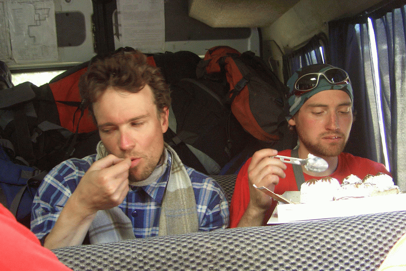 В Кадамжае зачем-то остановились возле магазина, и все, как одичалые, пошли туда на экскурсию. Внутри было скучно, я вернулась в автобус, улеглась на сиденье и заснула. Разбудило возвращение народа, причём наш инструктор притащил большую коробку с тортом, который потом в дороге весело съели, используя оторванные кусочки картонной крышки вместо ложек и передавая коробку по очереди сидящим дальше.
