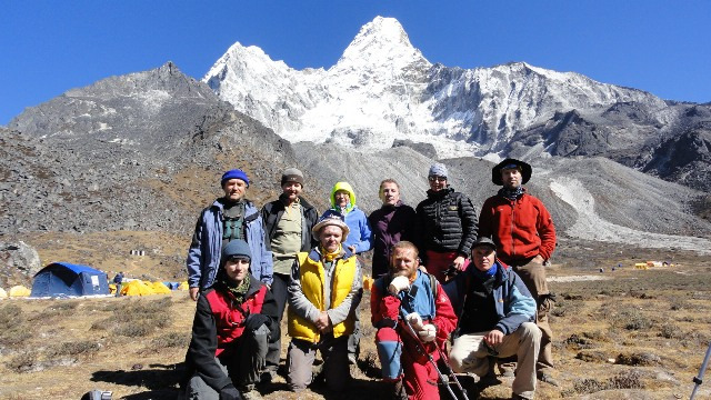 Сегодня мы идем к подножию Ама-Даблам в базовый лагерь на 4500 и обратно. С восходом солнца снова становится тепло, можно остаться в одной флиске. Когда тропа рванула вверх, я понял, что наша немолодая команда, не смотря на внешние не впечатляющие данные, подготовлена очень хорошо. Академики поднимаются без палочек, даже ром им не помеха. А палочки помогают очень и очень. Спасибо подъездным ступенькам – ноги тащат меня без сбоев. Через три с половиной часа дошли до базового лагеря. Лагерь представляет собой сборище разноцветных палаток. А над ним вертикально вверх взмывает одна из самых красивых вершин в окрестностях Эвереста - Ама-Даблам (6814м). По данным Википедии: «Ама» — означает мать или бабушка, а «даблам» — специальная подвеска, в которой старые женщины-шерпы носят драгоценные вещи. На горе есть висячий ледник, который напоминает даблам, а расходящиеся в стороны гребни горы представляются как материнские руки, разведенные для объятия.
