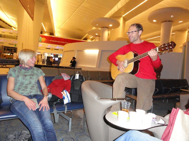 Вечером пели песни. Юра пел свои, Алексей-Баба (баба – это значит мудрый) тоже . Заслушаешься. Когда почти все разошлись, и остались только Алексей-Баба и Алла, я тоже спел песню, свою единственную - про сёрфера. Так, поржать. Я ее и песней-то не считаю. Собираю, как чукча, все свои приключения, и ору с надрывом под жесткий бой. Про то, как в гонках на полусогнутых ногах скачешь по волнам ништяк; про то, как ноги отстегиваются от усталости, а еще впереди фордак; про то, как парусом накрыло, а нога в петле; про то, как хочется дышать, помогите мне, ну и все в таком духе. Даже текста постоянного нет. Но Алле с Алексеем почему-то понравилось. И в Дели, в аэропорту, где куча людей они ко мне пристали спой да спой. И остальных еще подначивают: «такая интересная песня про сёрфера». Я, конечно, отбивался, как мог, говорил, что ерунда, что не заслуживает внимания, что аэропорт кругом, но девять человек с вискарем внутри… Взял я гитару, встал, оглядел безмятежных пассажиров, закрыл глаза, чтоб не видеть этого кошмара и заорал. Что делать, такая песня – тихо не поется. Отзвучал последний аккорд, сёрфер мой рвется вдаль, а я медленно с опаской открываю глаза. Юра же не знал, что это песня-кричалка, он медленно, со свойственной ему толерантностью, гасит шторм внутри и приходит в себя. Алла с Алексеем улыбаются, довольнёхонькие своей проделкой. Мальчишка – индус вытянул руку большим пальцем вверх. Ну, хоть кому-то понравилось. Решили выпить еще.