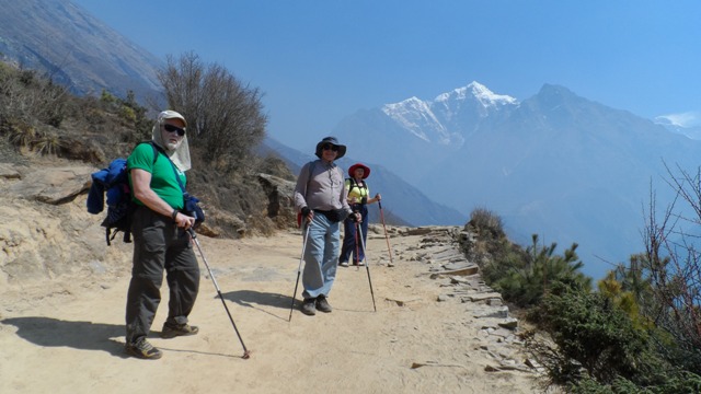 В 5 утра подьем. Наверх уходим втроем, у остальных желание пропало. А Акуленко Валерий сходил на Кала-Патар еще вчера. Погода отличная, все склоны накрыло снегом, но впереди нас уже есть группы. По их следам и мы поднялись на эту панорамную вершину (5600 м), откуда хорошо видать Эверест и близлежащие вершины. Фотографируемся на память! Наши поздравления Неустроеву Никите, в свои 14 лет, это его своеобразный рекорд! Уходим вниз, сегодня нам еще надо спуститься в Дингбоче, где мы оставили свой депозит. Спустились к лоджии к 8 часам, все только проснулись. Завтракаем и уходим вниз. На тропе встречаем нашу двойку из Великого Новгорода – Огаркова Александра и Смолину Елену! Они решили не спешить, как мы , а больше акклиматизироваться, в планах у них нет восхождения на Айленд пик! Желаем им удачи и до скорой встречи в Намче Базаре! Еще ниже еще одна приятная встреча – свою группу к Эвересту ведет Томек Кобельский, известный польский альпинист! Вместе с ним мы были под Хан-Тенгри, потом в составе польской экспедиции, мы вместе поднялись на Эверест в 2006 году и вместе были в польской экспедиции на К-2 (Чогори) в 2010 году. Поговорить удалось только 10 минут, ему наверх, а нам вниз на отдых!