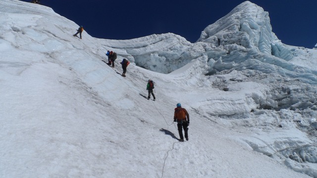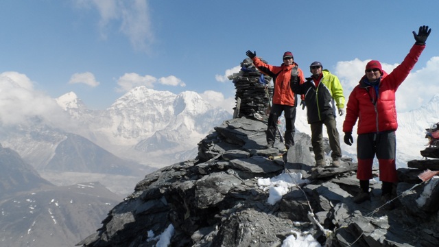 За ними, через час, выходят остальные – урало-московская команда. Через три часа догнали на скалах Акуленко Валеру. Оказалось, что у Круглова Дмитрия появилась температура и непальский гид повел его вниз, Валера остался ждать нас. Хочется отметить непальского гида – он спустил Дмитрия и догнал нас на подьеме! Уже вместе мы вышли на ледник, перешли все трещины и поднялись к стене. В 7 утра впятером мы стояли на вершине Айленд пика! Мы первая группа, а снизу уже поджимают другие. Фотографируемся командой на фоне Южной стены Лходзе и начинаем спуск. На перемычке уже затор, решаем дюльферять по нашим веревкам, чтобы не стоять, не ждать. Еще вчера на вершину сходила только одна группа, сегодня ее штурмует более 30 альпинистов! Мы успеваем спуститься до подхода других групп. Небольшой отдых и быстрее вниз. К 12 часам дня мы в базовом лагере! Пьем чай и едим шоколад. Пришли снизу наши портеры и собирают палатки. В 14 часов уходим вниз, на отдых в Чукунг.