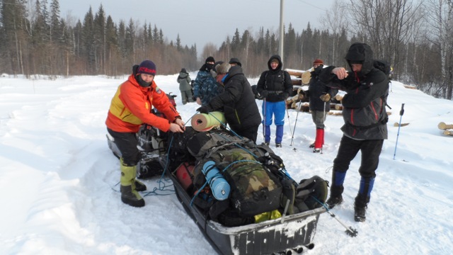 Переодеваемся в Газели во все теплое, загружаем рюкзаки в сани. Руслан уезжает наверх, а мы все идем пешком налегке.